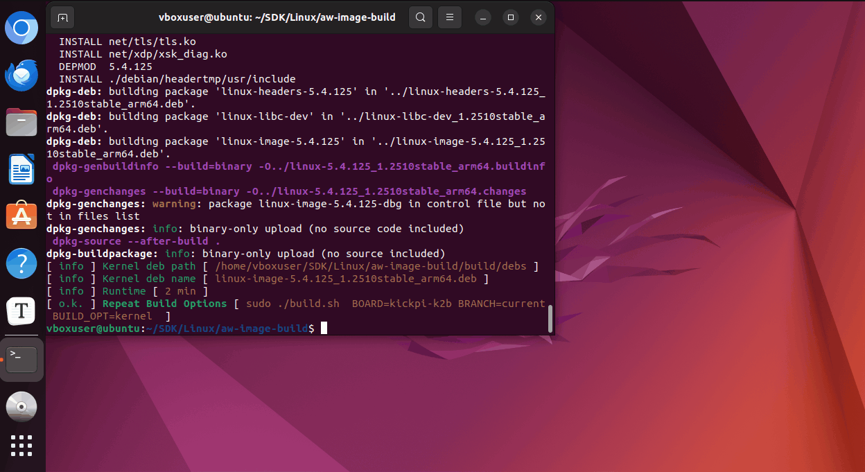 4.根据Kernel deb path找到生成的内核deb包,传输到正在运行的主板中, 在主板终端中使用dpkg -i linux-***.deb,重启主板,内核更新成功。