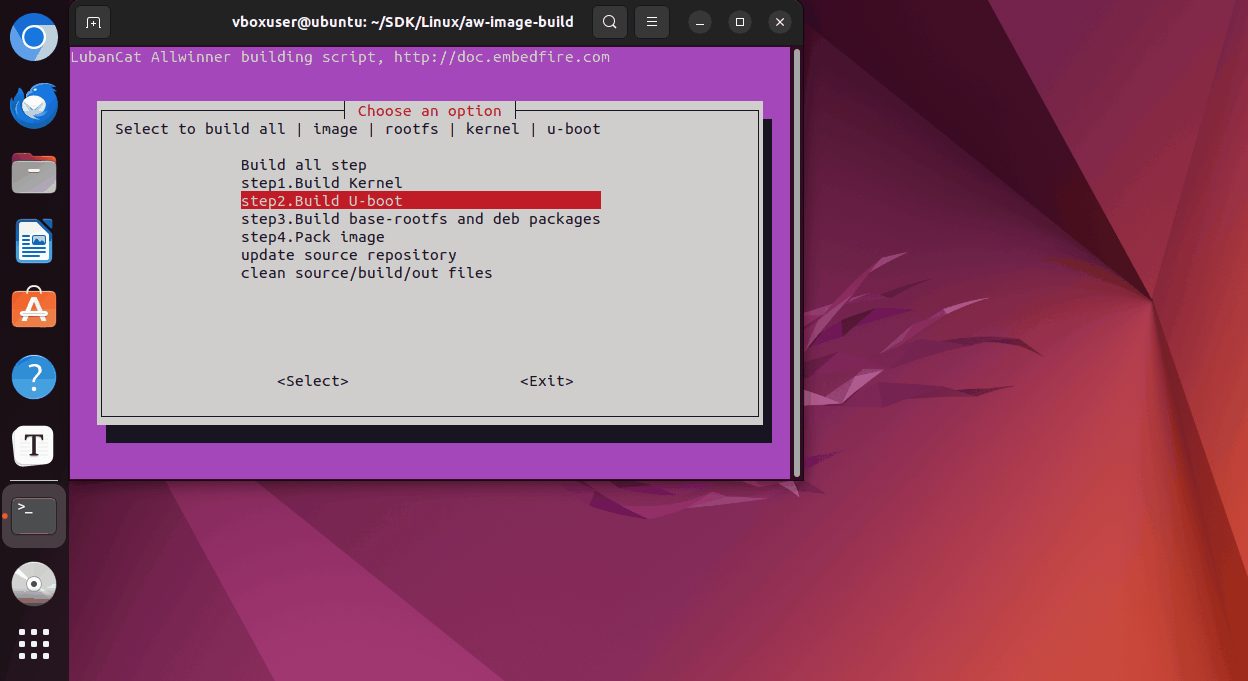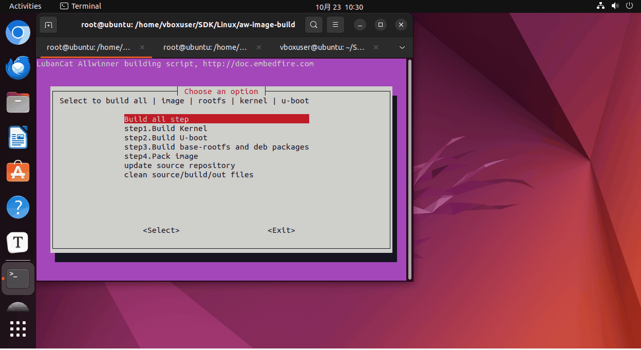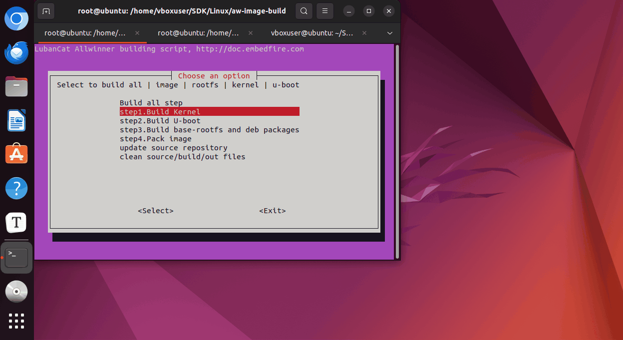 对用户而言,如果要对主板进行二次开发,预装应用、修改调试内核等,就涉及到了根文件系统或内核的单独构建, 此时可以选择单步构建的方式。